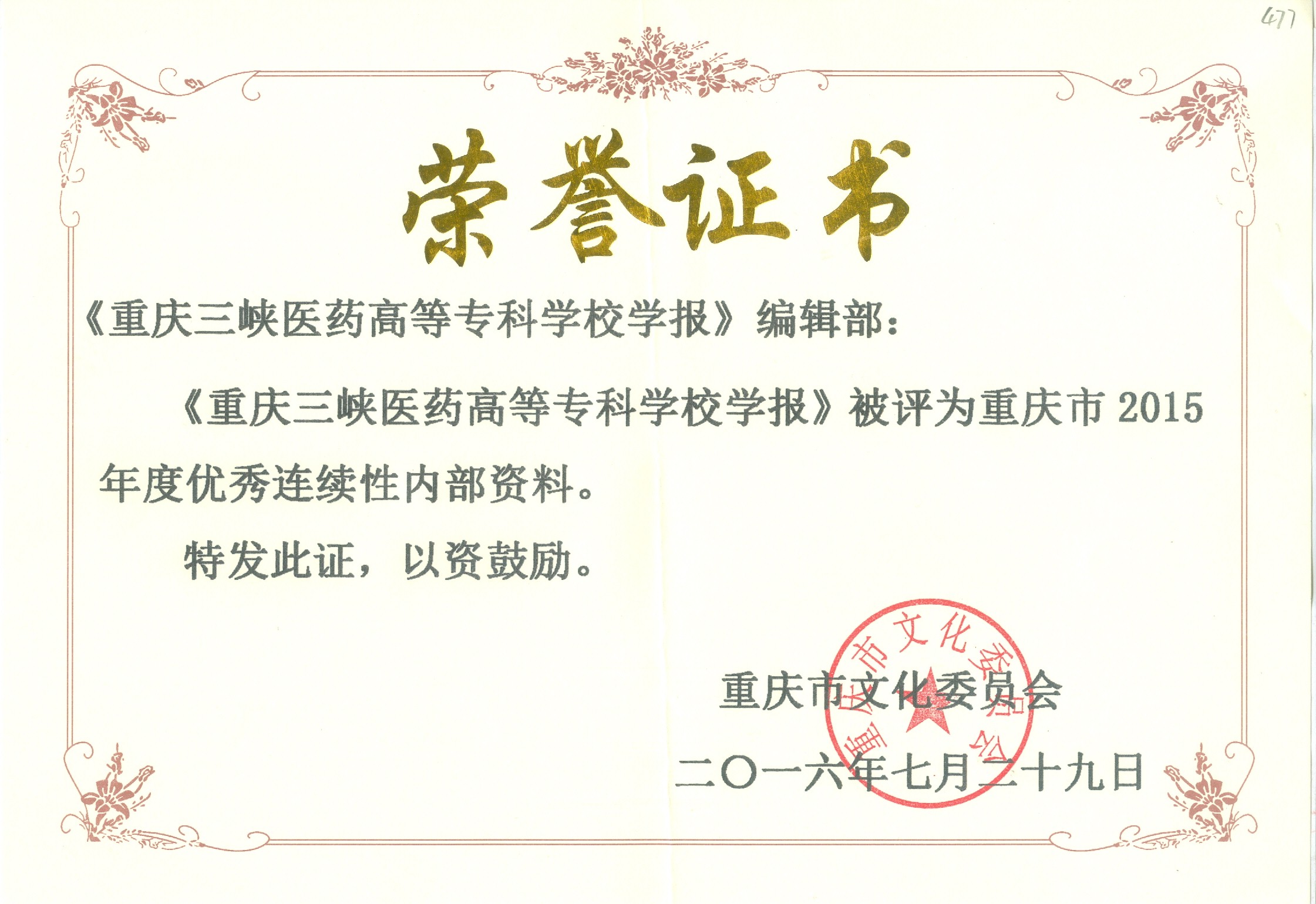 《学报》荣获2015年度重庆市优秀内部连续性资料