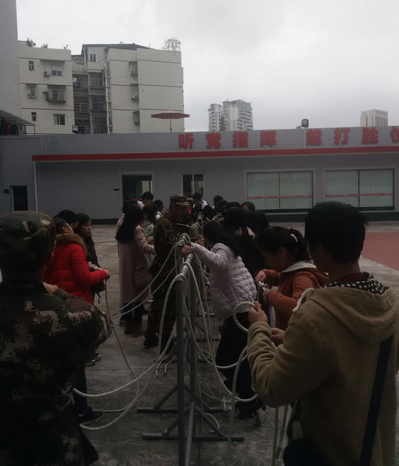在解说员的带领下,志愿者们先参观了中队的消防车辆以及配备的应急装备,了解到各方面的消防抢险救援知识。随后参观了消防官兵营房,观看了战士现场表演折“豆腐块”,同学们对干净整齐的营房叹为观止。紧接着来到训练场,在官兵的指导下,志愿者们学习了绳索快速打结,并穿戴了消防战斗服。最后在官兵的指导下,体验了滑绳自救。