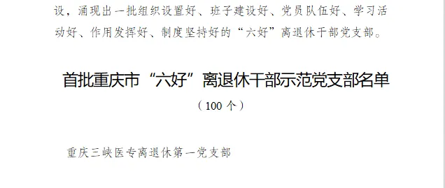 近日,我校离退休第一党支部被中共重庆市委老干部局评为首批重庆市“六好”党支部。离退休第一党支部围绕市委老干部局提出的组织设置好、班子建设好、党员队伍好、学习活动好、作用发挥好、制度坚持好等“六好”标准,坚持“退休不褪色、离岗不离心”,通过实施“三领三示范”党建工程,全面提升工作水平。