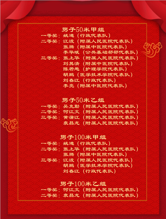 比赛设置男子、女子50米和100米项目(不限泳姿),并按年龄分为甲、乙两个组别。泳池内,选手们奋力挥臂、你追我赶,水花翻涌间尽显拼搏风采;看台上,观众掌声雷动,加油声此起彼伏,现场气氛热烈而有序。裁判团队严谨执裁、公正评判,工作人员细致服务、保障到位,医疗保障人员全程值守、随时待命,各方力量共同构筑起赛事顺利推进的坚实后盾。经过激烈角逐,各项比赛均顺利完成:女子甲组50米与100米项目均由附属人民医院代表队林俊摘得桂冠,男子甲组50米及100米冠军则由行政代表队的姚迪夺得;乙组比赛中,行政代表队覃江霞包揽女子50米、100米第一名;男子50米乙组冠军为附属人民医院代表队吴克勤,100米乙组第一名由附属人民医院代表队何江文获得。