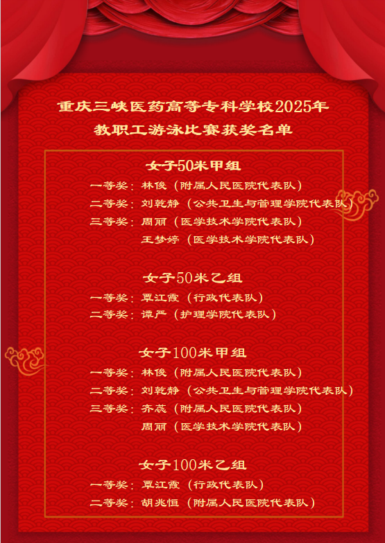 为丰富教职工体育文化生活,增强团队凝聚力与向心力,9月25日下午,重庆三峡医药高等专科学校2025年教职工游泳比赛在学校游泳馆圆满落幕。本次比赛由学校工会与公共基础部联合承办,吸引了各处(室)、院(部)及直属附属医院教职工积极参与,充分展现出全校教职工良好的精神风貌与高涨的运动热情。