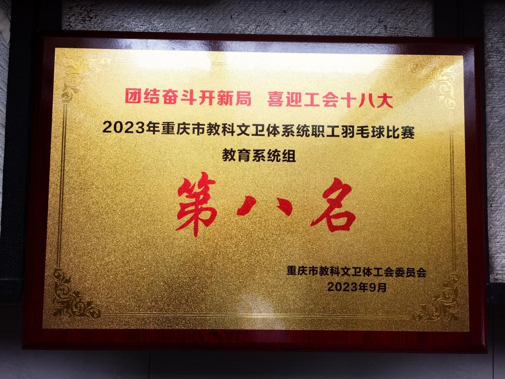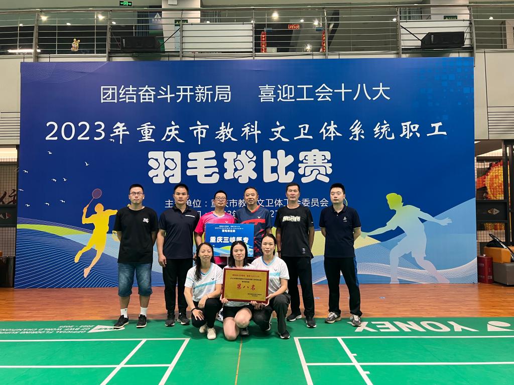 “团结奋斗开新局 喜迎工会十八大” 2023年重庆市教科文卫体系统职工羽毛球比赛于9月26日至27日在江北区众邦(金源)羽毛球中心举行,学校教职工羽毛球队奋勇争先、顽强拼搏,经过两天紧张激烈的六场比赛,荣获教育系统第八名,实现了我校教职工羽毛球队参赛名次历史性突破。
