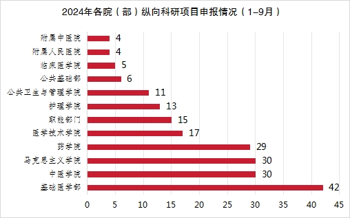 图1 2024年各院(部)纵向科研项目申报情况(1-9月)