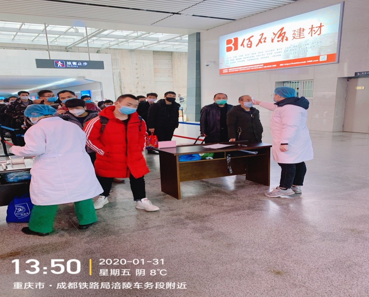 2016级潘腾旭同学在涪陵火车站防控点对人员作体温筛检