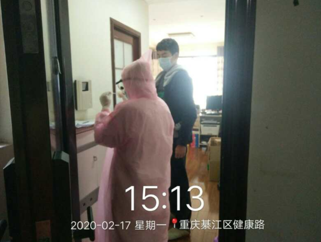 2016级白宇杰同学穿上雨衣戴着游泳镜在綦江区文龙街道入户为密切接触者做健康监测