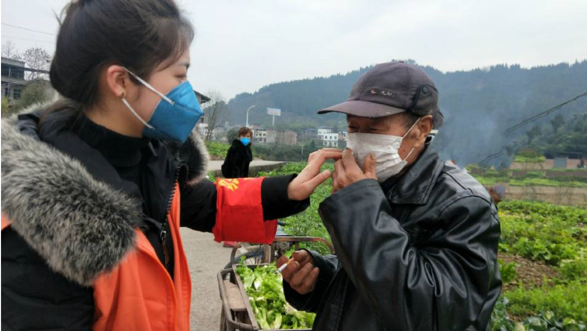 2017级简晓妮同学在开县临江镇当志愿者指导村民正确佩戴口罩