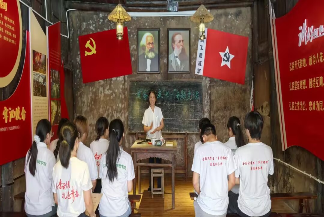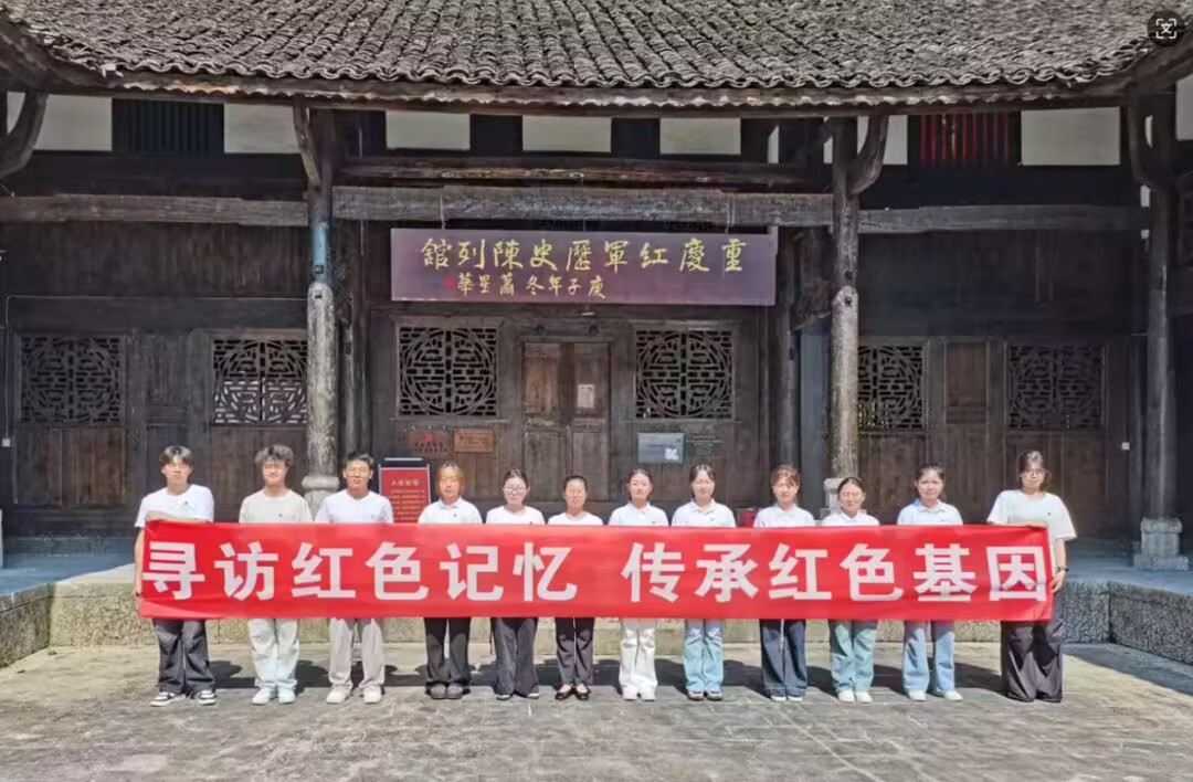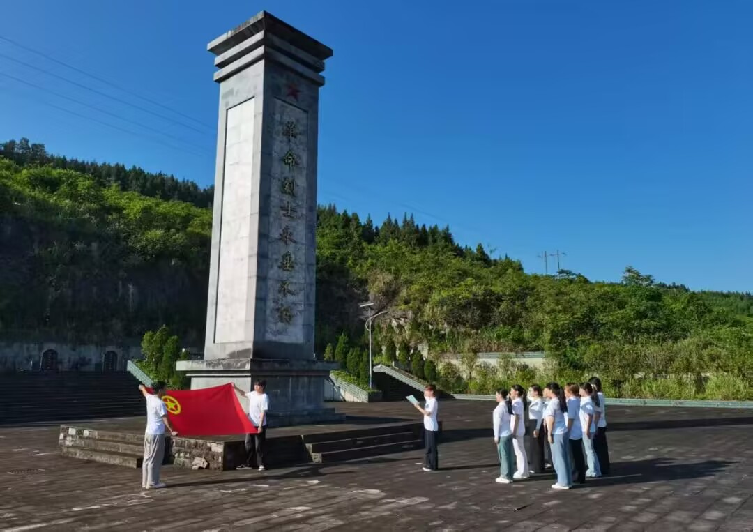 推普服务队在黄家镇举行“寻访红色记忆 传承红色基因”红色主题研学系列活动。在笔架山烈士陵园,同学们神情肃穆、身姿挺拔,深情凝视着巍峨的革命烈士纪念碑,面对鲜艳夺目的团旗,重温入团誓词。同学们缓缓登上台阶,轻轻将花束敬献于碑座之下。随后,他们绕碑瞻仰,目光追随着碑上的事迹,仿佛能从中探寻到先烈们的英雄足迹。走进重庆红军历史陈列馆先锋社区黄学珍三合院聆听“一张留言条”背后感人至深的红色故事,参观馆内陈列着众多珍贵历史文物和资料,感受到了军民间生死相依、血浓于水的深厚情谊和当今幸福生活来之不易。来到“世界苗乡 红色小镇”,走在黄家镇先锋社区红军街,透过一砖一瓦、一草一木,都留下了鲜明的红色文化印记,沉浸式感受红色文化、寻访红色记忆。在红军街“黄家镇先锋社区新时代文明实践站”“黄家坝新时代红色基因传习所”举行了《讲好红色故事 传承红色基因》主题微党课,聆听和学习“红船精神、红军精神、红岩精神”精神内涵。入党积极分子 2024 级卫生信息管理 1 班姜文鑫同学,结合红色主题研学感悟,满怀激情地分享研学心得,王叶强同学带领实践队员齐诵《七律·长征》,让红色基因在他们的血脉中澎湃激荡。