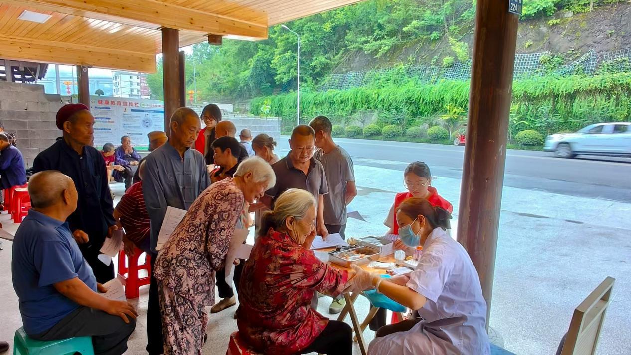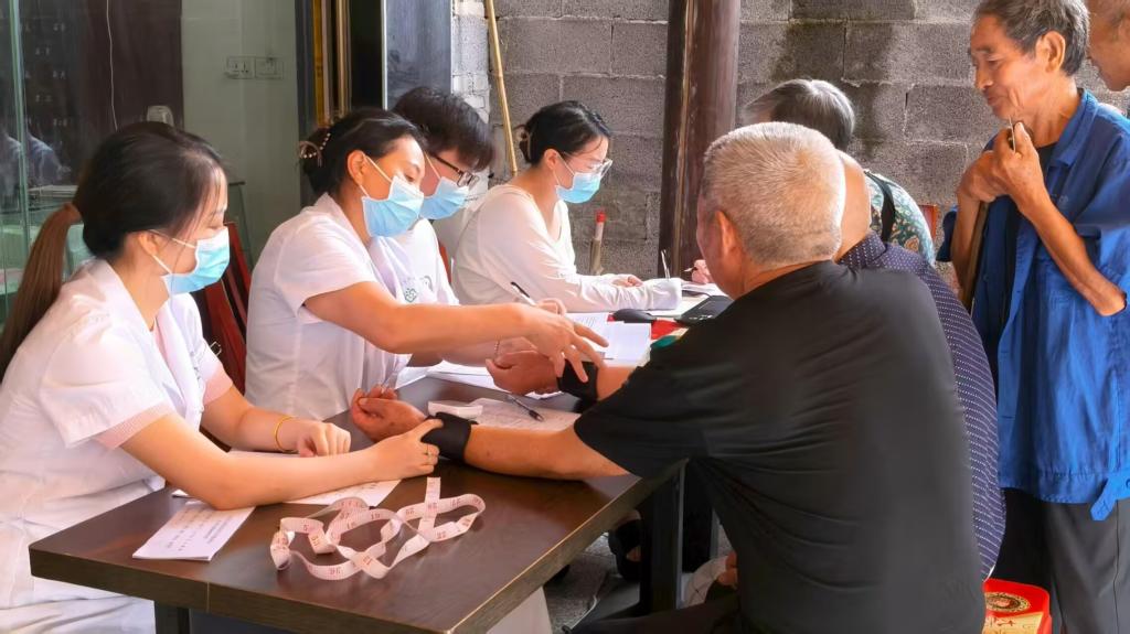 推普服务队继续跟随社区卫生服务中心到下塘村协助开展健康体检,为村民讲解体检流程,帮助填写健康信息表,协助医护人员测量血压、血糖,做好健康数据记录,确保每位村民都能清楚知晓自己的健康状况。