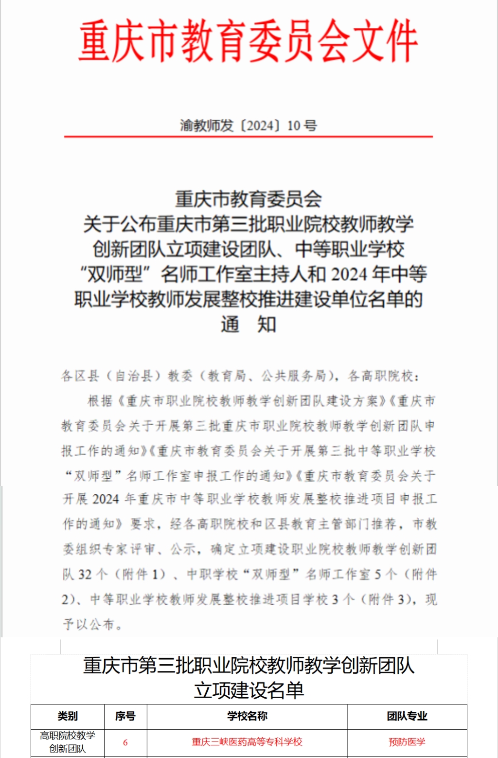 近日,重庆市教育委员会公布了第三批重庆市职业教育教师教学创新团队建设单位名单,我校预防医学专业教师教学创新团队从全市多所高职学校中脱颖而出,成功获批立项建设。