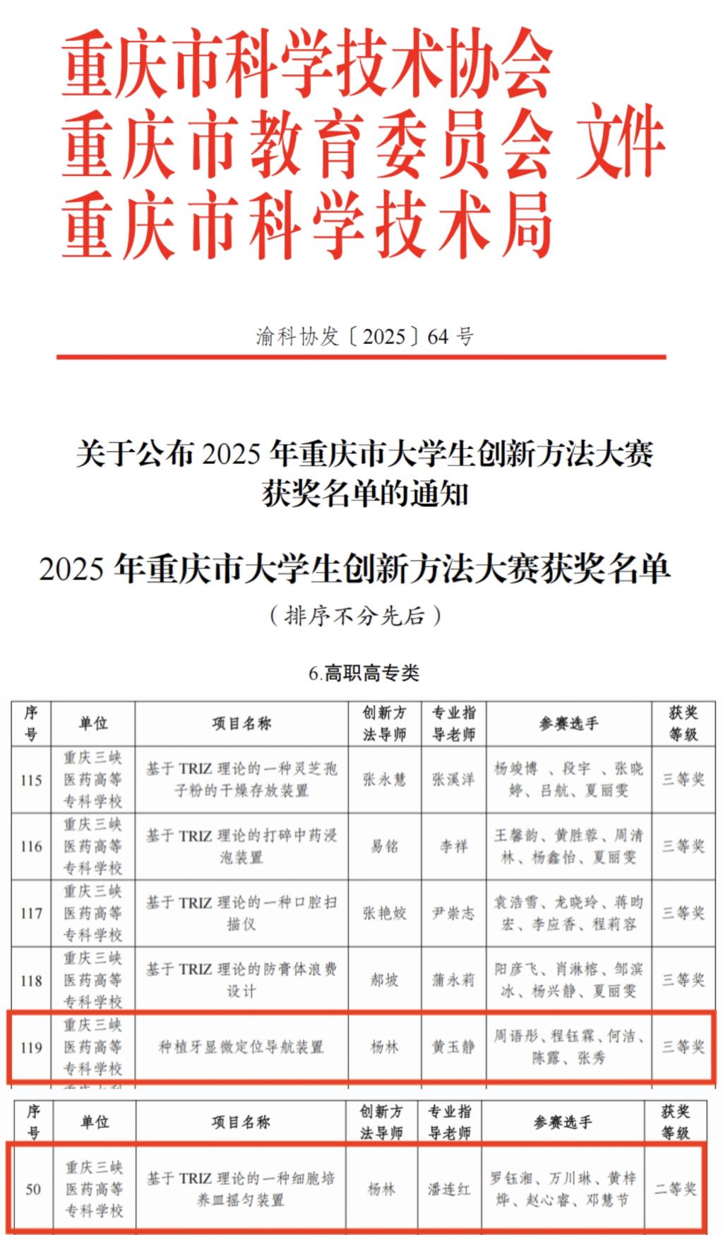 近日,2025年重庆市大学生创新方法大赛获奖名单正式公布(渝科协发〔2025〕64号)。本届大赛由重庆市科学技术协会、重庆市教育委员会、重庆市科学技术局联合主办,旨在激发大学生创新意识,提升实践能力,服务重庆创新驱动发展。