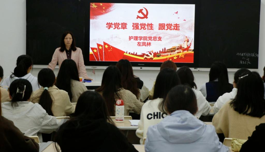 10月21日,护理学院党总支书记、院长左凤林以“学党章 强党性 跟党走”为主题,为全院43名入党积极分子讲授专题党课,引导青年学子从党章中汲取信仰力量,筑牢思想根基。
