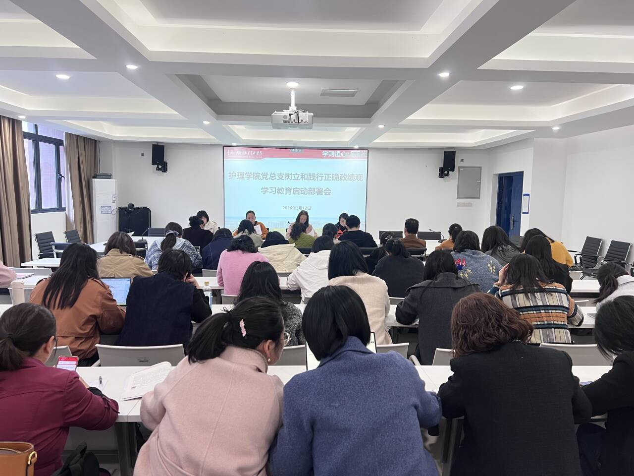 3月12日下午,护理学院党总支在B6-315会议室召开树立和践行正确政绩观学习教育启动部署会。学院全体党员参会,会议由学院党总支书记、院长左凤林主持。