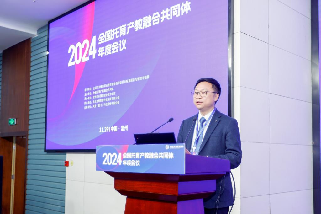 11月29日,由全国托育管理与服务专业指导委员会主办,常州纺织服务技术学院、北京金科职桥科技有限公司承办的“全国托育产教融合共同体2024年年会暨托育产教融合、科教融汇专业人才队伍建设论坛”在江苏常州召开。国家卫生健康委人口家庭司、教育部职业教育发展中心、江苏省、四川省等地区托育行业主管单位、各共同体成员单位的领导、专家、教师代表共计200余人参与了本次论坛。学校作为全国托育产教融合共同体副理事长单位受邀参会,校党委委员、副校长李小山,托育中心园长张抒影参与了会议。