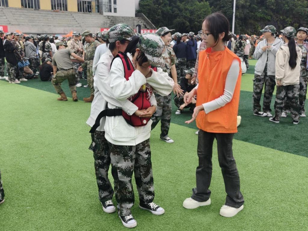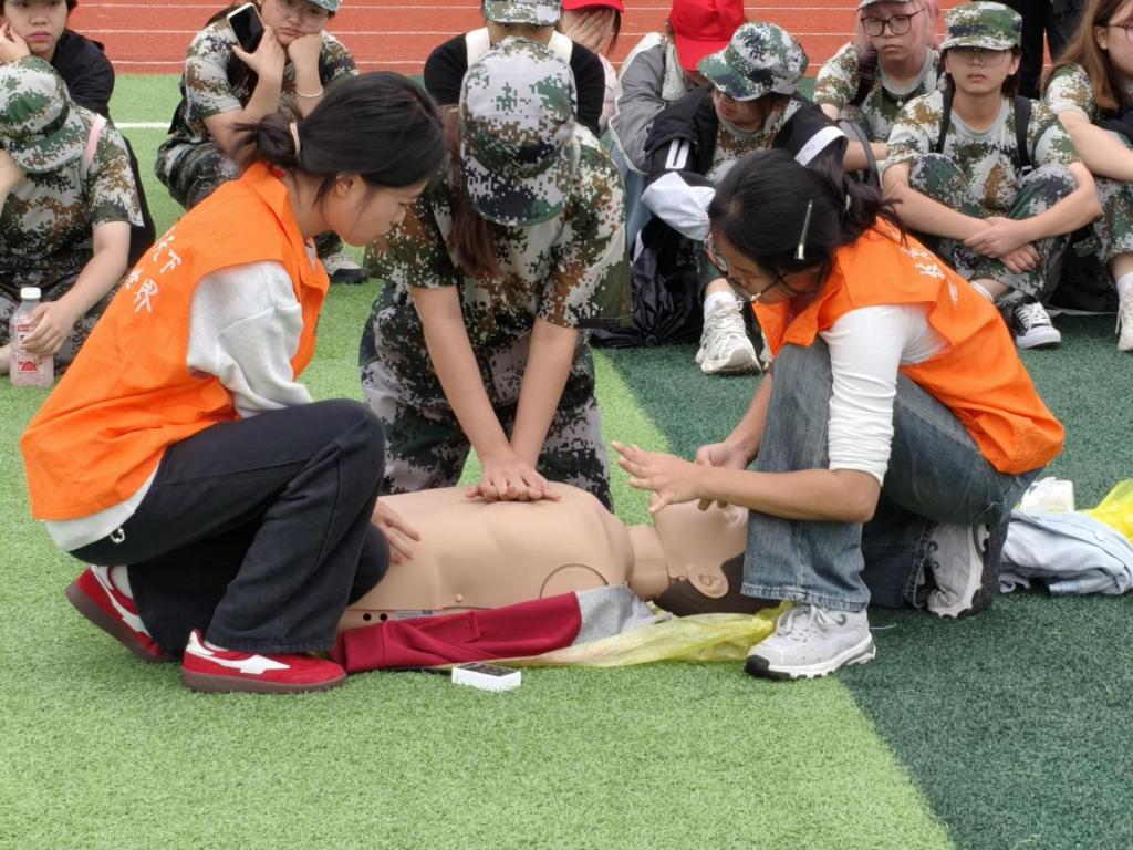 军训中,“急救小导师”们深入各个连队,开展生动有趣的急救知识宣讲。他们利用人体模型现场演示心肺复苏操作,详细讲解每一个步骤和注意事项。在互动环节中,新生们积极参与,亲身体验急救操作,在"小导师"的指导下掌握正确的按压位置和力度。