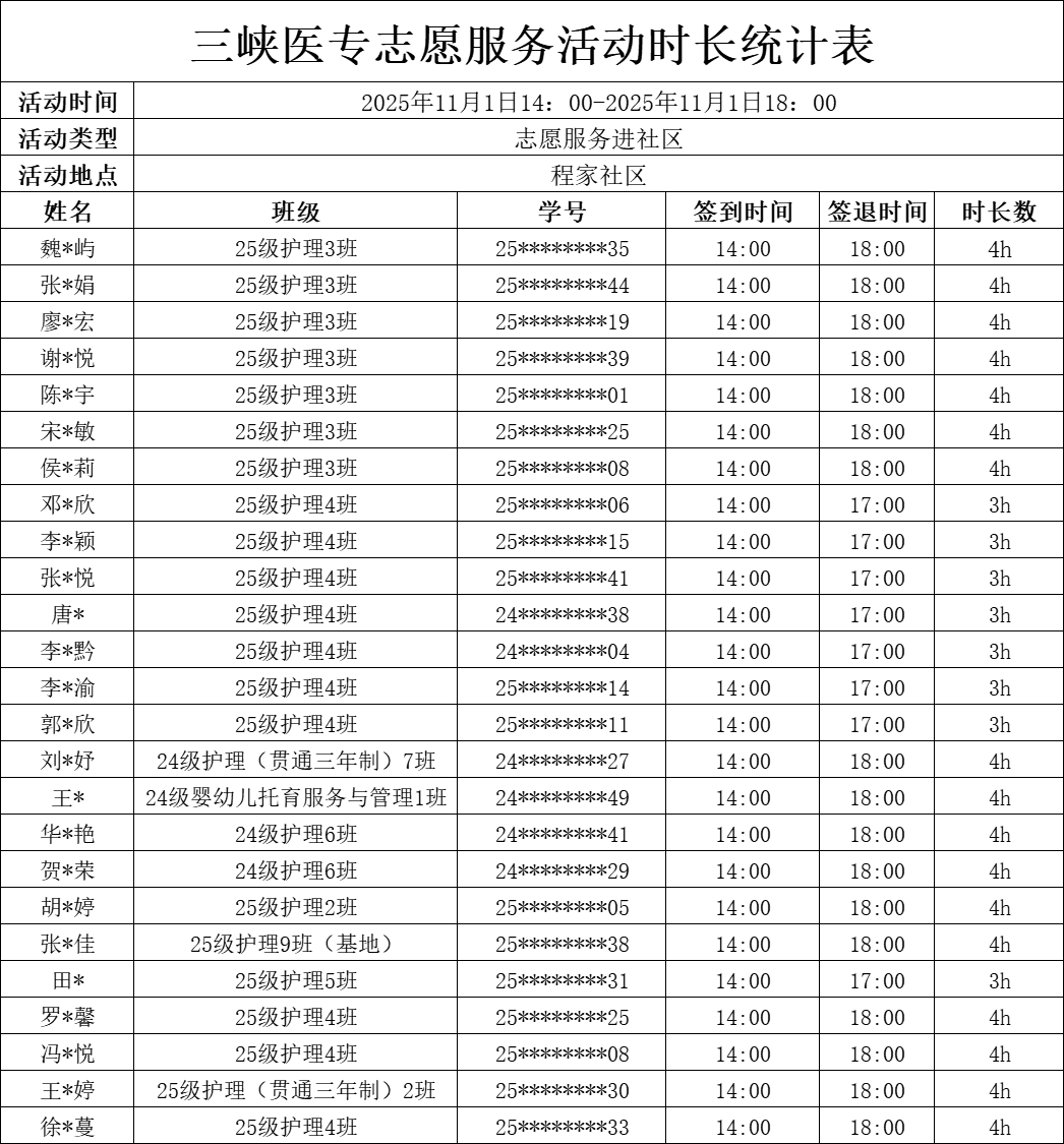 本次参与义诊的班级共8个,合计51名同学。其中2025级护理1班和2025级护理2班前往文华福利院,2025级护理3班和2025级护理4班前往程家社区,2025级护理5班和2025级护理6班前往第二福利院,2025级护理7班和2025级护理8班前往学府社区。现将本次志愿时长情况公示如下: