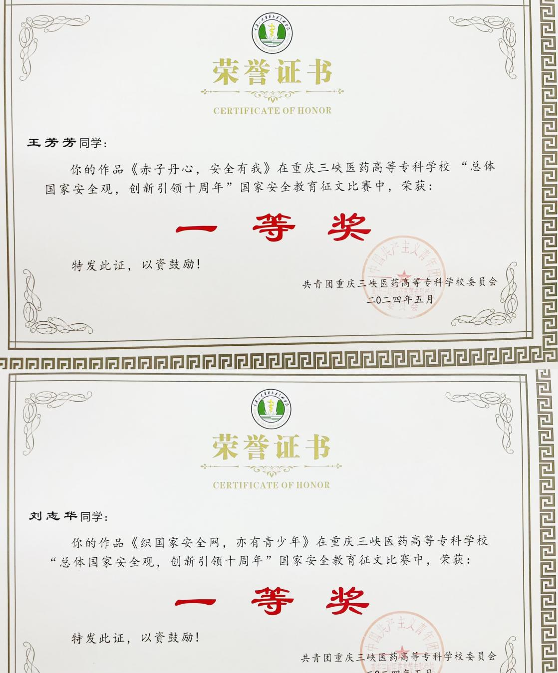 在“总体国家安全观,创新引领十周年”征文比赛中,我院层层选拔,在参与同学中推荐5篇征文到学校。最终,刘志华,王芳芳获得一等奖。