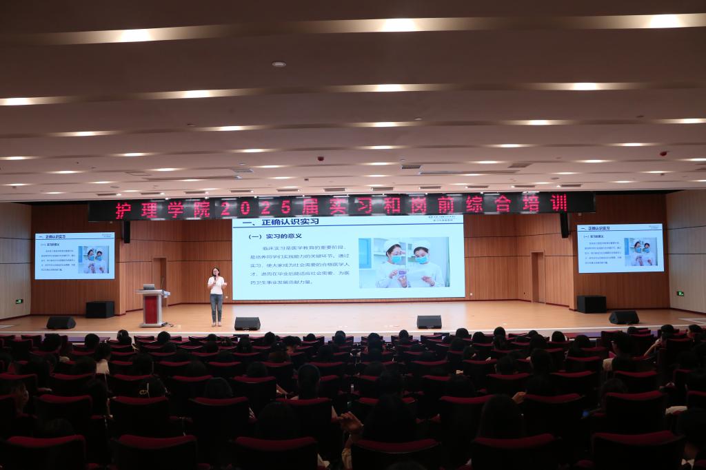 为提升2025届学生实习质量,规范实习生行为,帮助学生更快适应临床环境,更好开展临床实践,6月21日下午14:30,护理学院专职副书记李红丹在四教报告厅开展以“岗前培训促提升,逐梦前行向未来”为主题的岗前培训。学院辅导员代表及300余名学生参与了此次培训。