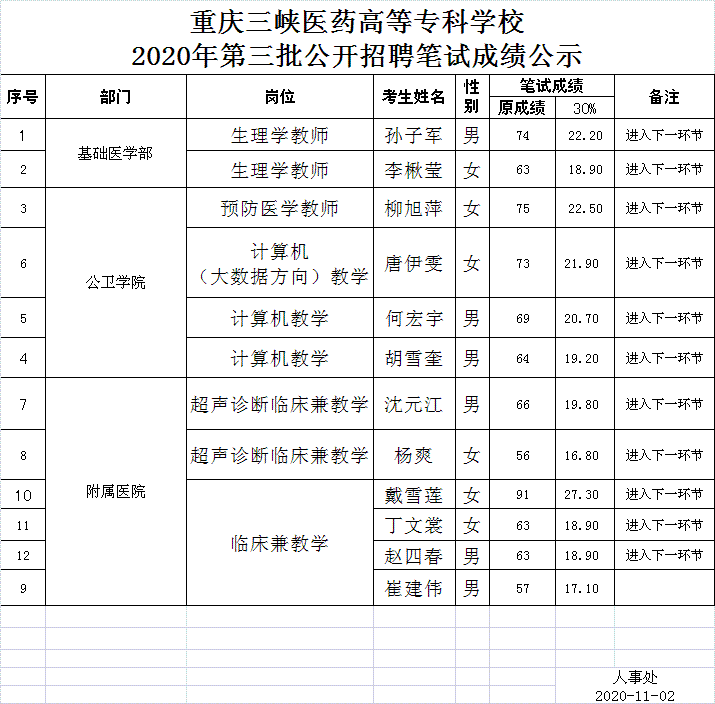 重庆三峡医药高等专科学校2020年第三批公开招聘笔试成绩公示