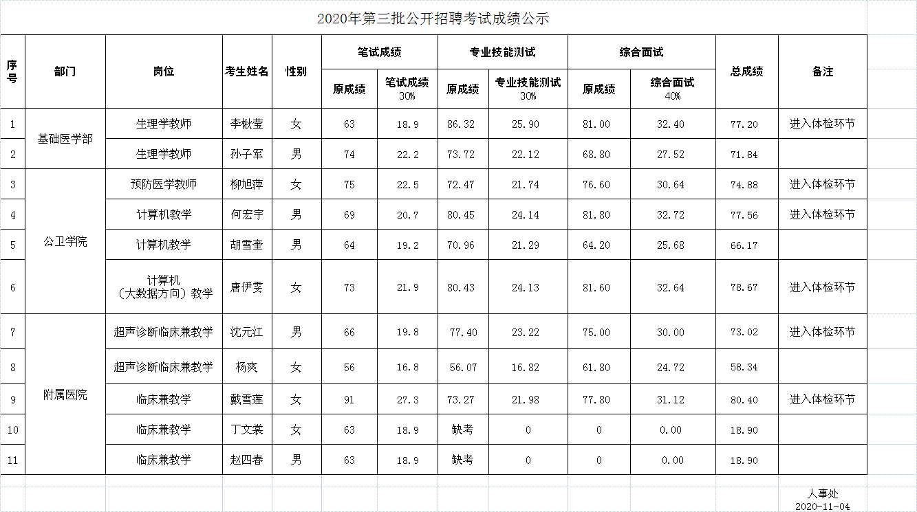 重庆三峡医药高等专科学校2020年第三批公开招聘考试成绩公示