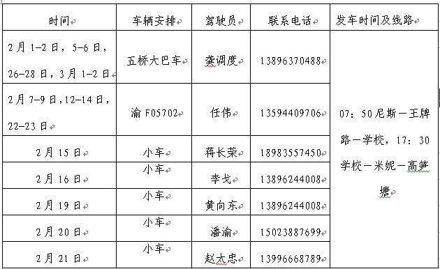行政总值班等各类值班必须严格按排班表执行。值班人员必须坚守岗位,认真履职。行政总值班要切实做好学校值班总牵头工作,安全保卫班、网络值班等要切实负责好24小时安全值班,值班人员必须做好值班记录及交接工作,重要情况及时向值班领导请示或汇报。假期的通勤车安排为: