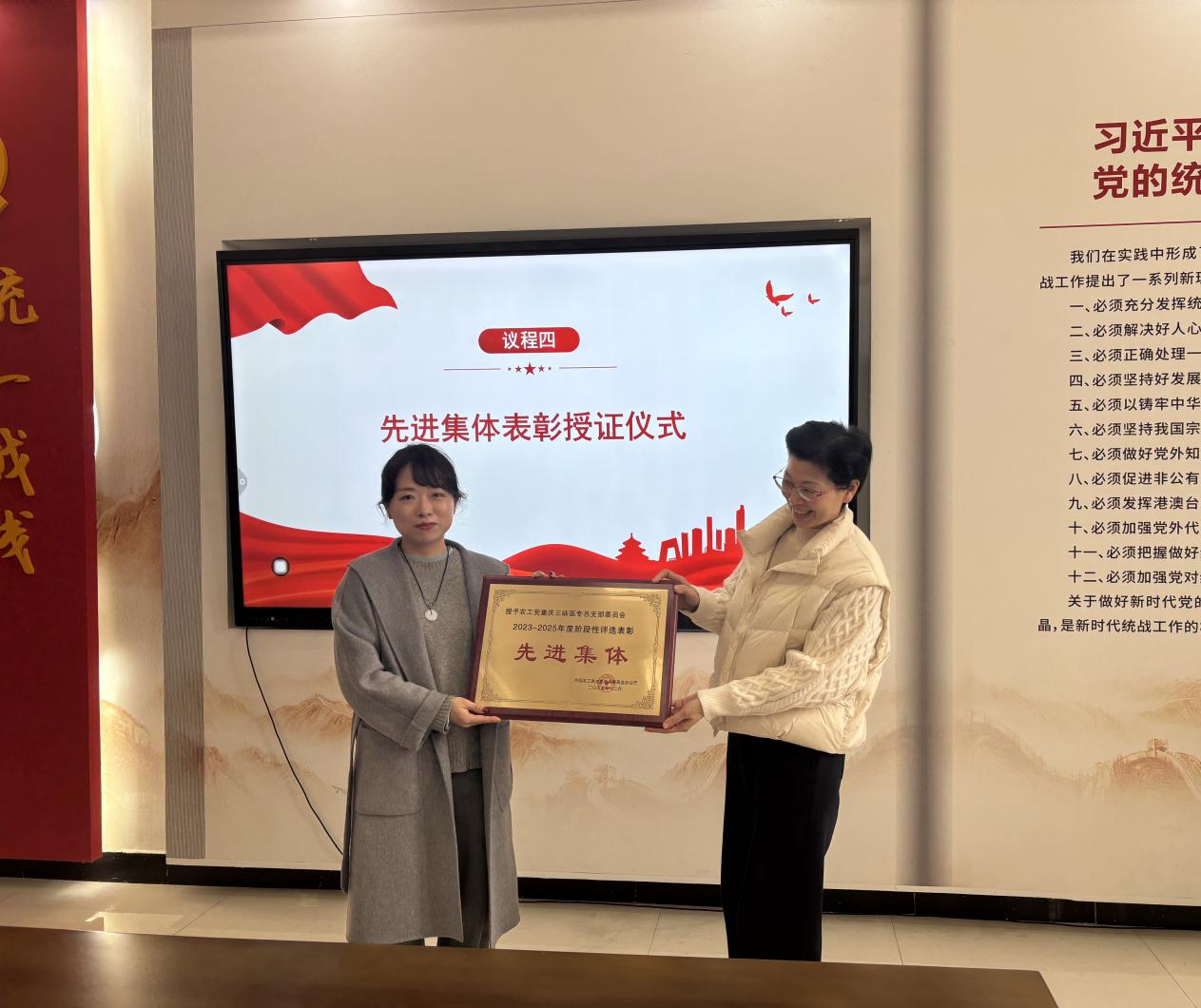 会议举行庄重的农工党中央基层组织先进集体授证仪式陈书鸿宣读农工党中央《关于表彰基层组织先进集体的决定》,邹宜芬为农工党三峡医专总支颁发基层组织先进集体证书。