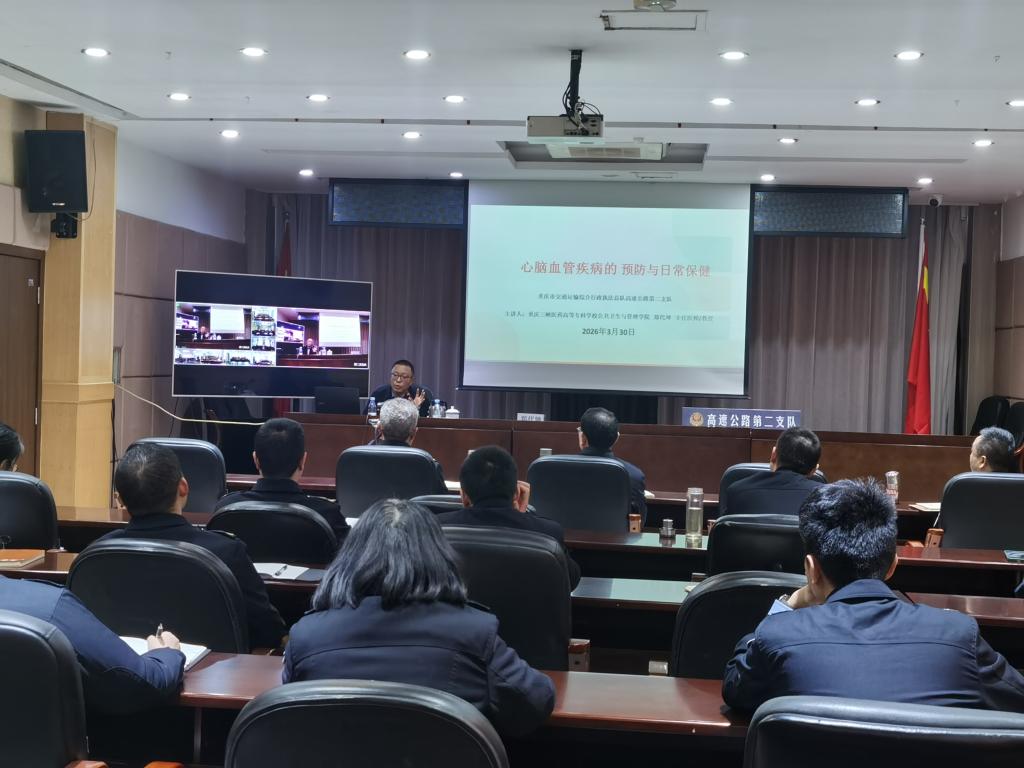 3月30日,在全国“双带头人”教师党支部书记“强国行”项目引领下,重庆三峡医药高等专科学校公共卫生与管理学院直属党支部书记、副院长郑代坤主任医师(教授)走进重庆市交通运输综合行政执法总队高速公路第二支队,开展“心脑血管疾病的预防与日常保健”专题健康科普讲座,两百多名交通执法人员聆听讲座。