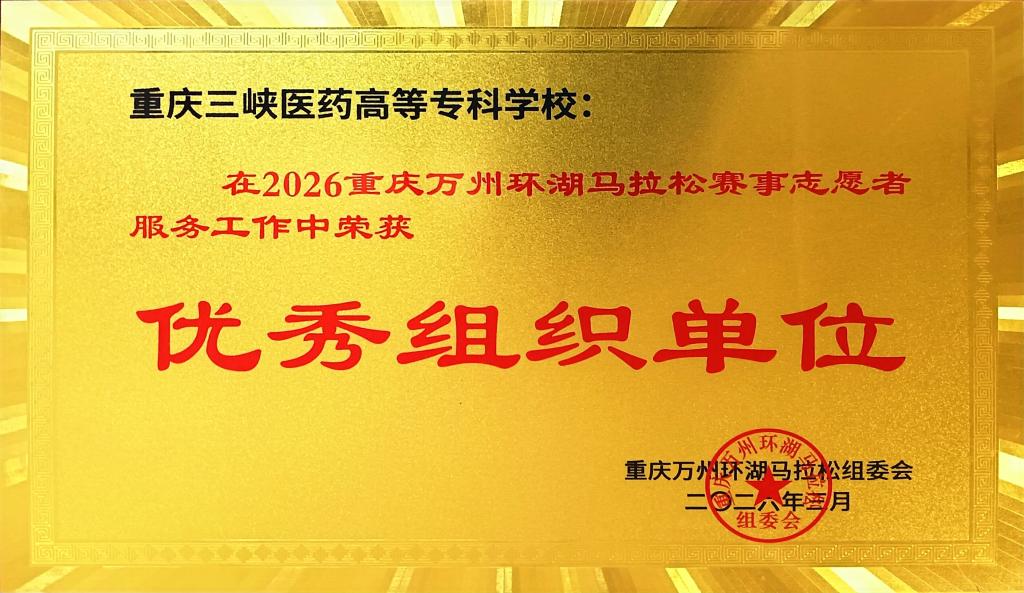 近日,2026年重庆万州环湖马拉松赛事圆满落幕,我校凭借高效的组织协调工作与志愿者团队的出色表现,荣获赛事“优秀组织单位”称号。