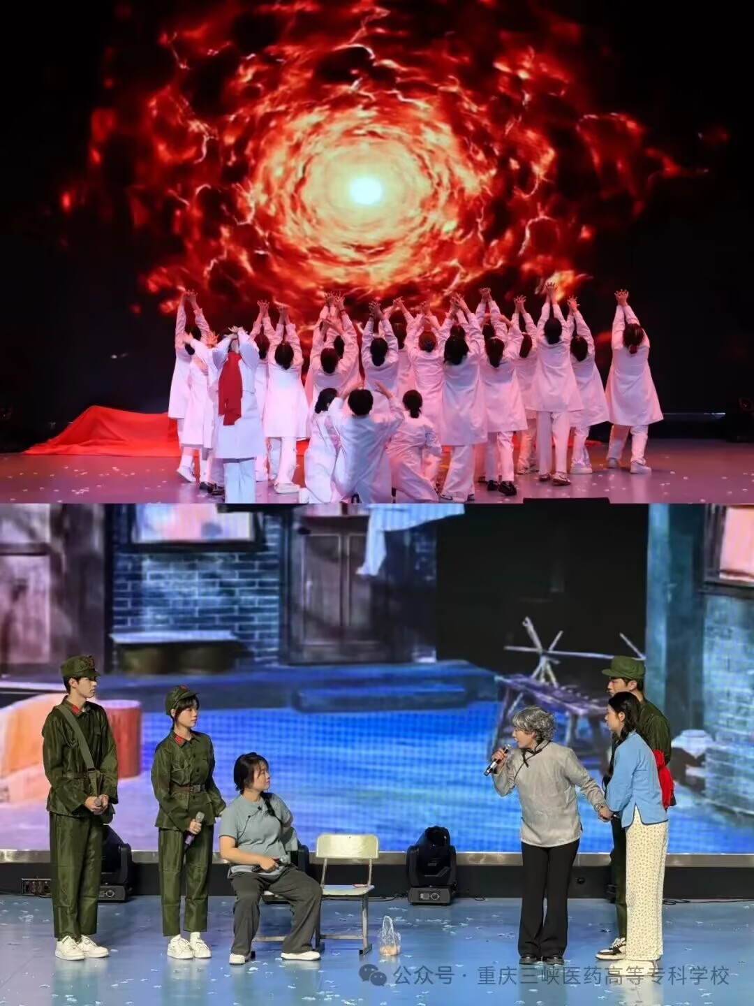 文艺汇演以“红岩铸魂・薪火相传”“红医励志・仁心笃行”“青春逐梦・医路向阳”“薪火赓续・医颂华章”四个篇章层层铺展。歌舞剧《红岩红》以炽热情感再现红岩英烈群像;舞蹈《急救艺术家》将急救技能化作灵动舞姿;舞台剧《绝壁天路》、歌舞《有我》、合唱《送你一朵小红花》等节目轮番上演、亮点纷呈。整场演出将红岩精神、红医文化与医学专业教育深度融合,以艺载道、以情动人、以美育人,呈现了一场兼具思想深度、文化温度与艺术质感的视听盛宴。