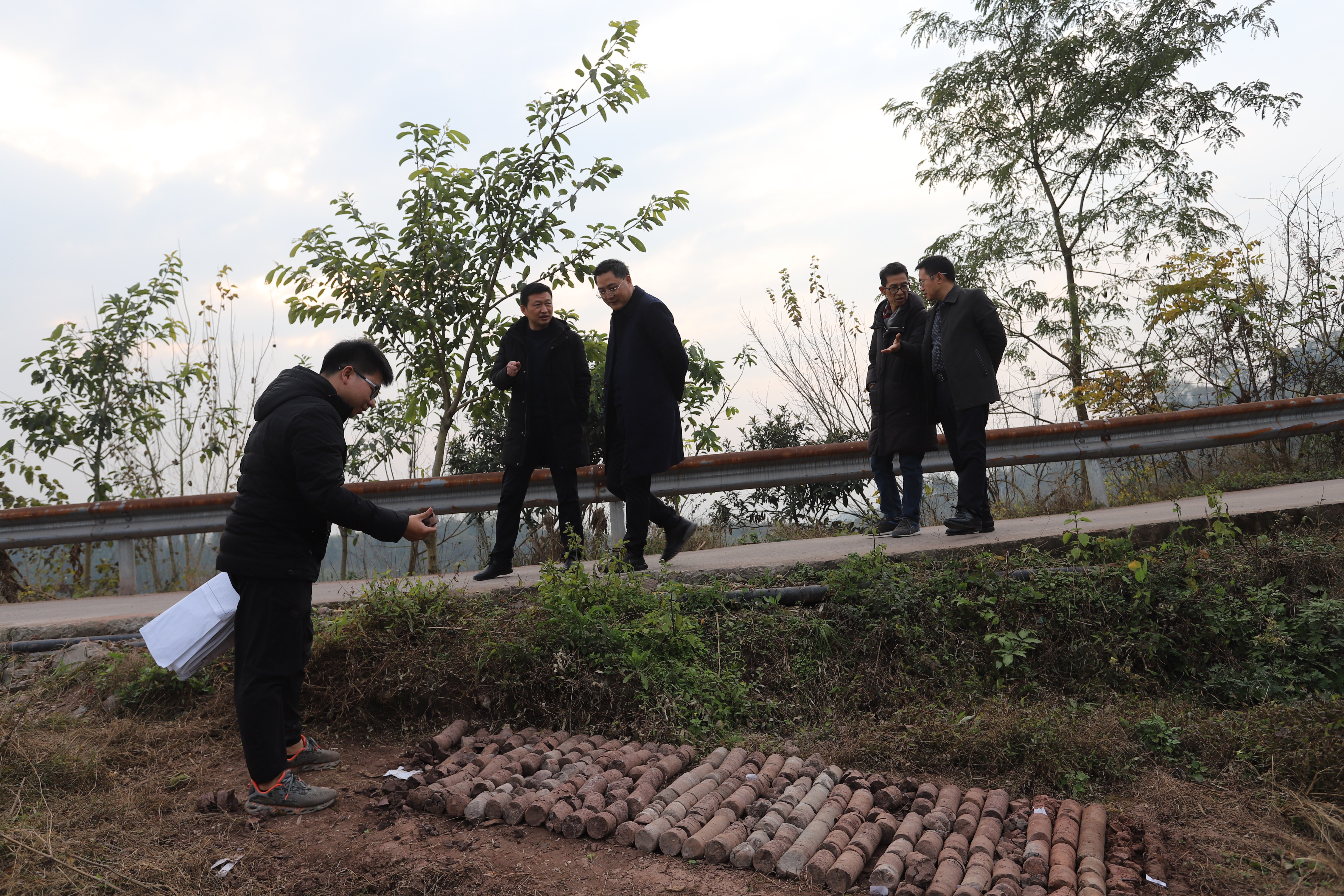 学校基建后勤处处长袁重斌对高峰校区征地、拆迁和地质勘查等工作作了汇报。陈地龙仔细查看了钻探出来的土质样本,与开展地勘的负责人和相关工作人员进行深入交流,向岩土勘查工作负责人员提出了钻孔质量和加快工作进度的要求,强调要在保证质量的同时,尽快出具勘查报告,为下一步设计和施工提供参考。