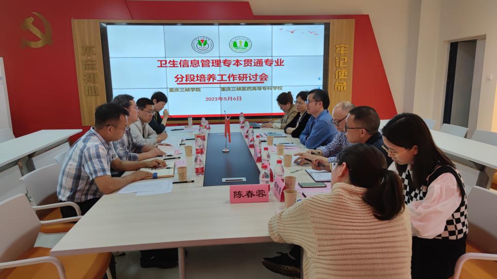 为保证专本贯通分段培养人才质量、明确人才培养目标、完善人才培养方案,推进贯通培养教学一体化和课程紧密衔接,5月6日下午,我校邀请重庆三峡学院专本贯通培养项目相关负责人来校召开专题研讨会。重庆三峡学院教务处副处长方伟鉴、计算机科学与工程学院书记杨家云、副院长李洪兵、信息管理与信息系统系主任钟静,学校副校长沈力、教务处处长邓雪松、公卫学院院长杨柳清、副院长郑代坤、卫生信息管理教研室主任刘丽君及该专业相关教师共13人参加。会议由邓雪松主持。