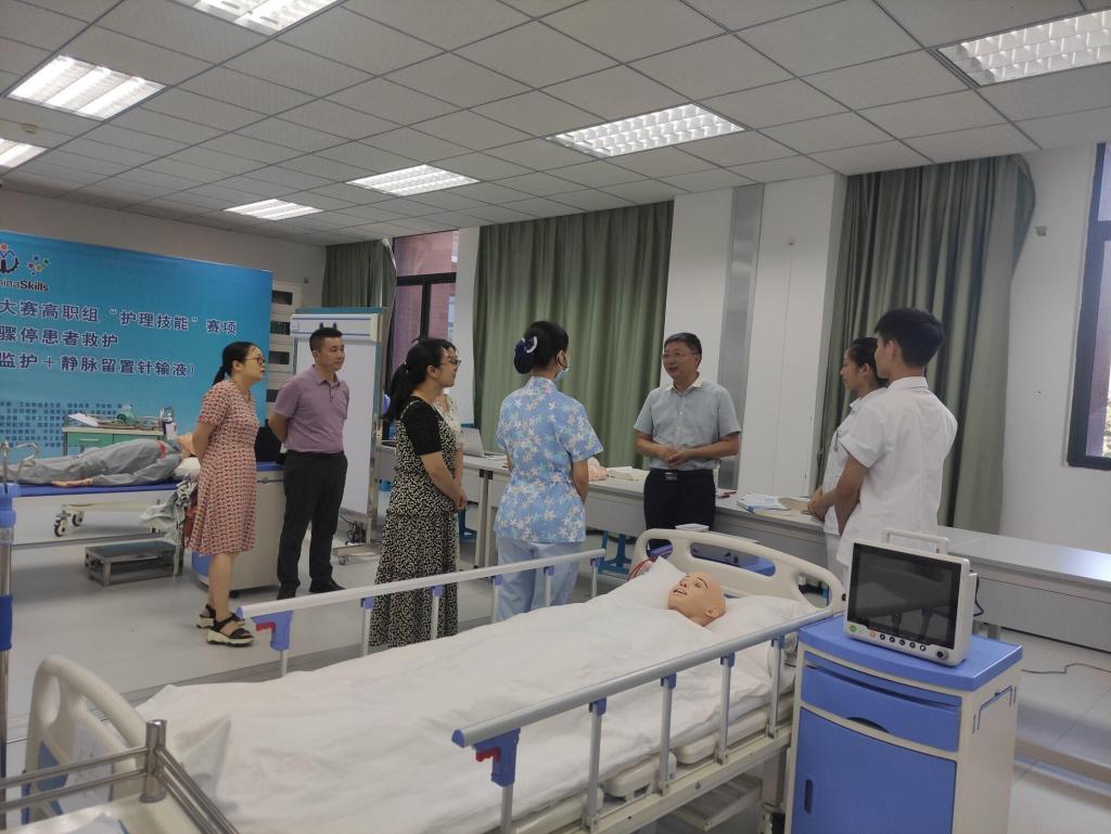 随后,冉隆平一行前往护理学院、医学技术学院看望留校备战全国职业院校技能大赛的师生团队。在备赛实训基地,冉隆平与备赛师生亲切交谈,详细询问选手们留校期间的学习、生活等情况,了解师生备赛状态、训练安排以及当前存在的困难。他对备赛师生放弃假期坚持训练的奉献精神和扎实的技能水平表示高度肯定,勉励各备赛团队在克服高温和保证安全的基础上,精心准备、锐意进取、全力以赴,以饱满的精神状态及过硬的实训技能在各赛场上展示三峡医专学子的专业风采,并预祝各备赛团队取得优异成绩。