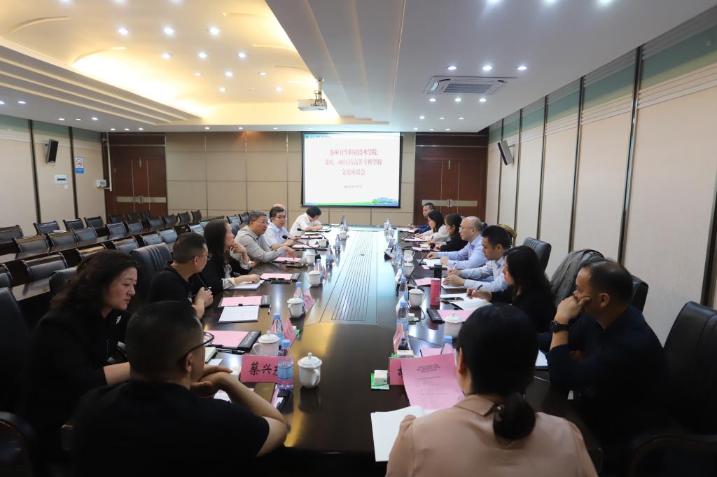 会上,冉隆平对罗晓清一行的到来表示热烈欢迎,从历史沿革、基础建设、人才培养、专业建设和附属医院等方面介绍了学校的情况。他表示,加强校际交流沟通、协同提升育人成效意义重大,希望两校今后能探索校级交流工作机制,共推专业建设,实现资源共享,培养造就更多的医疗卫生专业技术人才。罗晓清介绍了苏州卫生职业技术学院基本情况、专业建设及办学成效,期望能进一步加强两校友好互助协作交流,搭建全方位、多学科、深层次对接互动平台,加快推动学校事业高质量发展。随后,双方相关负责人就人才培养、科学研究、学科建设等方面进行了深入探讨,交流气氛融洽热烈。