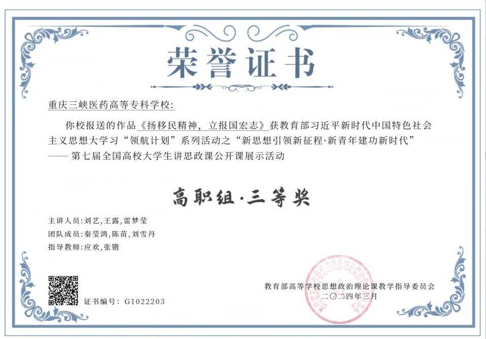 近日,根据《教育部办公厅关于开展习近平新时代中国特色社会主义思想大学习领航计划主题教育活动的通知》(教社科厅函〔2023〕14号)文件精神,“新思想引领新征程·新青年建功新时代”——第七届全国高校大学生讲思政课公开课展示活动已完成评审工作,我校马克思主义学院青年学生社团参赛作品《扬移民精神,立报国宏志》(指导老师:应欢、张锴)获全国高职组三等奖。