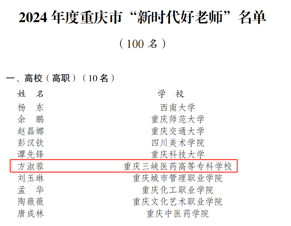 由市委文明办、市教委、团市委、市妇联、市关工委联合开展的2024年度重庆市“新时代好少年、好老师、好家长”学习宣传活动,经区县推荐、专家综合评审、组委会审定等环节,活动选树出“新时代好少年”100名,“新时代好老师”100名,“新时代好辅导员”50名,“新时代好校长”50名,“新时代好家长”50名。其中,我校党员教师方淑蓉荣获“新时代好老师”称号。