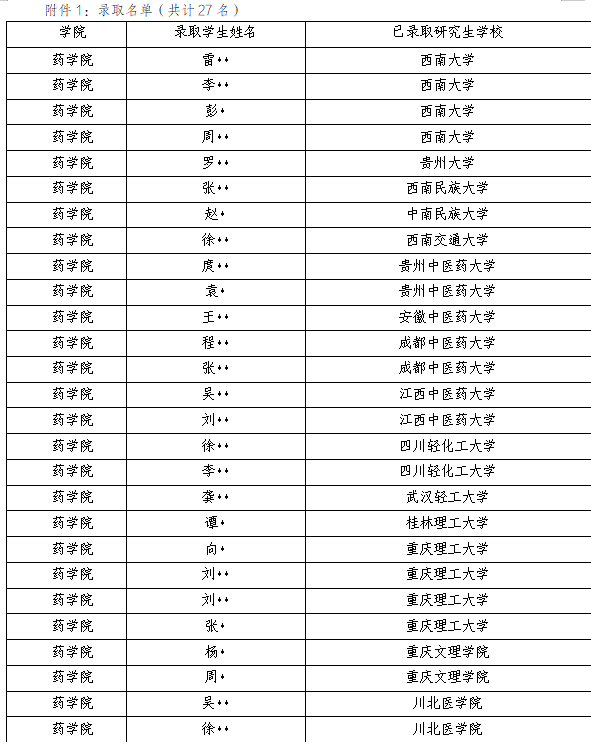 近日,我校再次传来考研捷报:在 2025 年全国硕士研究生招生考试中,药学院制药工程本科班 27 名学子被西南大学、贵州大学、西南交通大学、成都中医药大学、贵州中医药大学等知名院校录取。今年该班考研成绩实现 “三大突破”:报考率同比增长 1.37%,上线率、录取率均达 65.85%,分别较去年提升 21.11%、增幅 36.9%,三项核心指标再创历史新高,在考研竞争加剧的背景下实现逆势增长。