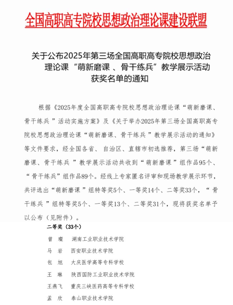 近日,全国高职高专院校思想政治理论课建设联盟公布了2025年第三场全国高职高专院校思政课“萌新磨课、骨干练兵”教学展示活动获奖名单,经全国各省、自治区、直辖市初选推荐,第三场“萌新磨课、骨干练兵 ”教学展示活动共收到“萌新磨课”组作品95个、“骨干练兵”组作品89个。经线上专家匿名评审和现场教学展示环节,共评选出“萌新磨课 ”组特等奖5个、一等奖14个、二等奖33个,我校教师王燕飞荣获“萌新磨课”组全国二等奖。