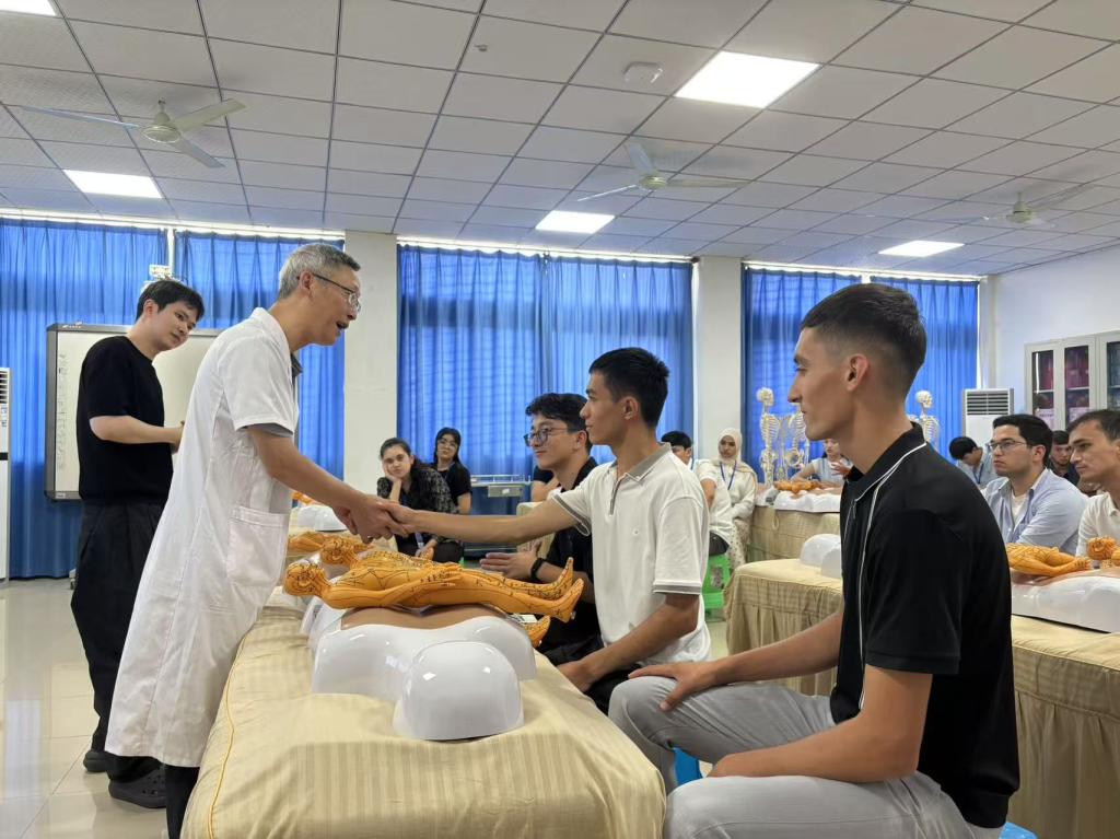 7月9日,带着对东方古老智慧的好奇与向往,乌兹别克斯坦医学生研修班的学员们,走进我校底蕴深厚的中医文化馆,开启了一场融合文化探源、功法习练、手法体验的独特旅程。从千年智慧殿堂的参观,到舒缓身心的八段锦学习,再到亲手实践中医按摩手法,学员们全方位领略了中医养生的奥妙与魅力。