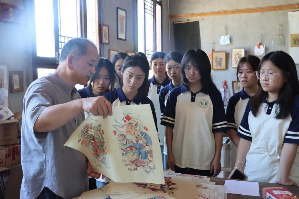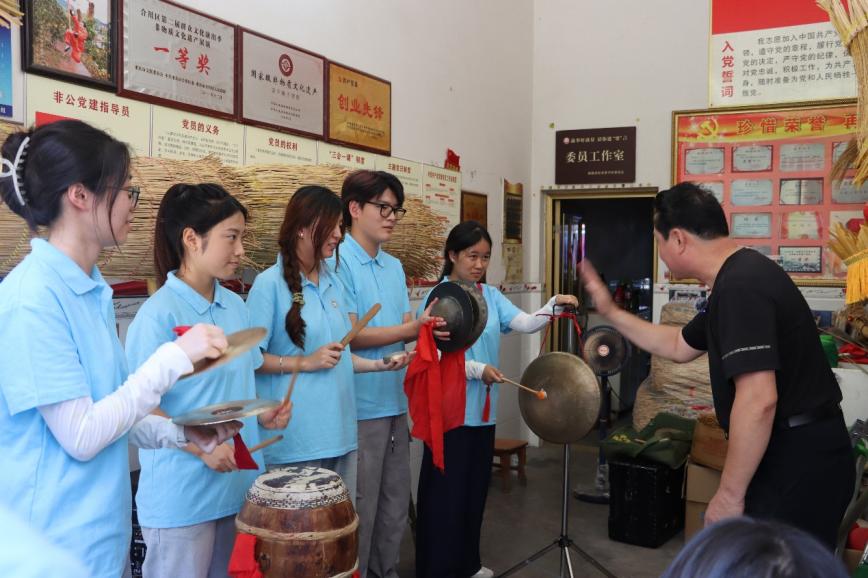 在梁平博物馆,队员们从《梁平赋》的铿锵字句中感受历史脉搏,在梁山古寨群的防御体系中领略古代军事智慧,更被梁平竹帘的精巧所震撼。走进国家级非遗梁平木版年画传承人徐家辉老师的工作室,队员系统学习了解了梁平木版年画的制作工艺,并在其的指导下体验了木版年画的雕刻与印刷等环节。当一幅幅鲜活的年画从指间诞生,匠人精神的真谛在这一刻变得具体可感——传统工艺不仅是技术的传承,更是文化的血脉。此外,“峡医青苗”团队还拜访了国家级非遗癞子锣鼓的传承人贺志灿。在其带领下,队员们深刻感受:癞子锣鼓的铿锵节奏让人热血沸腾,抬儿调的即兴唱词展现着民间智慧,草把龙的灵动腾挪传递着农耕文明的精髓。这些珍贵的非遗项目,既是记录历史的“活化石”,更是激活乡村文化记忆、推动文化振兴的“金钥匙”。