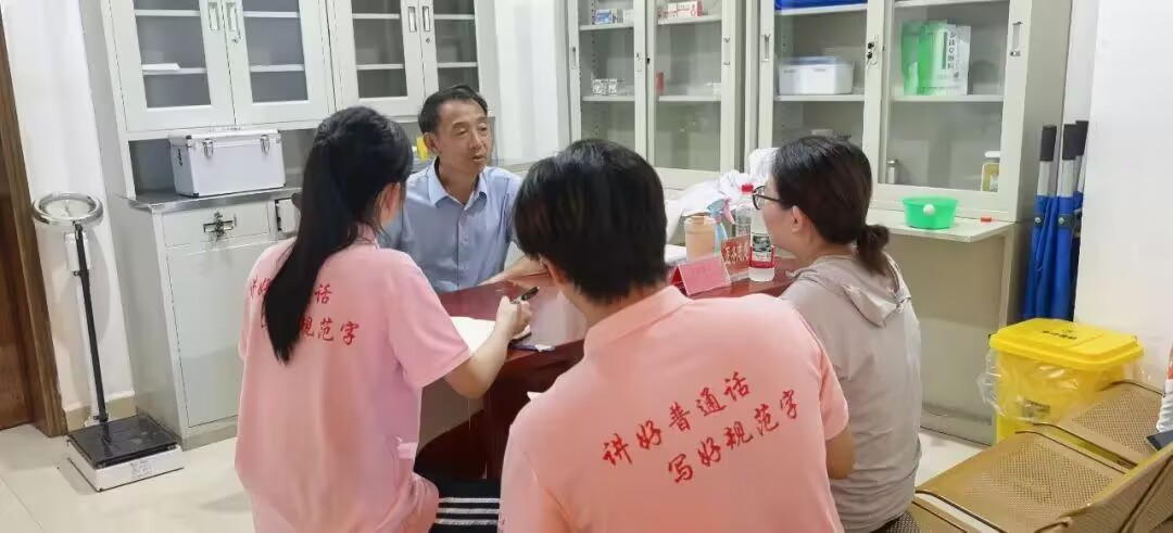 推普服务队走进彭水县汉葭街道、柏杨居民委员会,协助汉葭医院完成 2025 年村级老年人体检,开展“推普+急救知识宣传”主题活动。在公卫医师刘洪志手把手指导下,志愿者用通俗易懂的话语向村民解释体检流程和相关项目,将“乡音”和普通话融合,讲解肺结核防治、预防高血压及糖尿病等常见慢性病管理知识,并发放健康宣传手册。并走访了 10 户家庭,针对性地给予基础健康建议和家庭日常用药的注意事项。积极推广普通话,从紧急场景、医患沟通和数字生活适应等方面让村民认识到普通话在日常生活中的重要性。同时,在彭水县汉葭街道和红军渡广场周边,以《行走苗乡:彭水普通话应用调研》为题,推普服务队开展线上和线下实地调研。