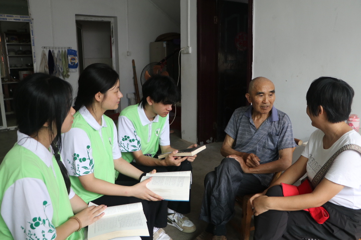 村里独居老人居多,陪伴和关怀对他们来说是最珍贵的。团队成员用放慢的语速、亲切的语调,一边推广普通话,一边科普健康知识——从高血压防控到夏季养生,把专业术语变成家常话。志愿者们握着扶国生老人的手唠家常,帮着读药品说明书,普及日常养生知识;博览群书的张德和老先生,向团队成员讲述他几十年坚持读书的故事,并嘱托同学们“一定要多读书,长才干,把握住人生的关键节点”。一个个小小的举动让乡音与“医语”交织成最暖心的陪伴,而同学们也接受了一场生动的行走的“思政课”。