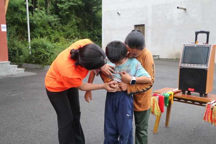 作为医药专业学子,志愿者们将专业所长融入推普实践,让健康知识随普通话一同走进村民生活。在中医药科普课堂上,志愿者们带来艾草、金银花等常见药材,用标准普通话讲解其功效与用法。针对突发状况的急救技能培训里,志愿者用清晰的普通话分步讲解心肺复苏、海姆立克法的操作要点:“按压深度要到5厘米,像这样双手交叠用力……”村民们在互动练习中,跟着志愿者的指令纠正动作,在重复“按压”“吹气”等术语的过程中,既掌握了急救技巧,也自然提升了普通话应用能力。
