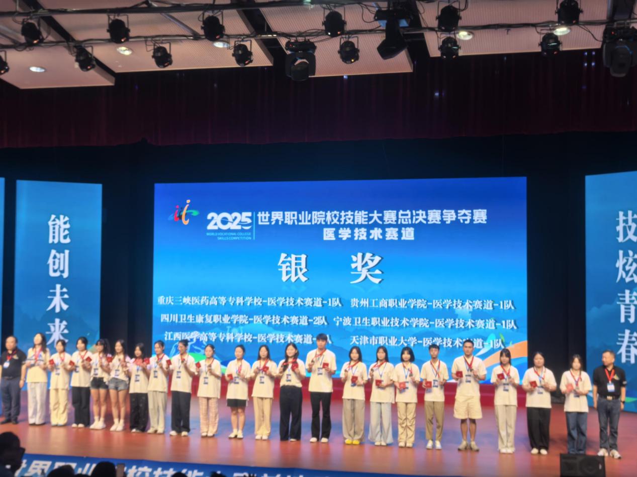 2025年8月18-23日,世界职业院校技能大赛总决赛争夺赛在信阳职业技术学院举行。我校王雨鑫等4名参赛选手在张冬梅院长及兰旭、谭英指导老师带队下参赛,荣获医学技术赛道(高职组)银奖。