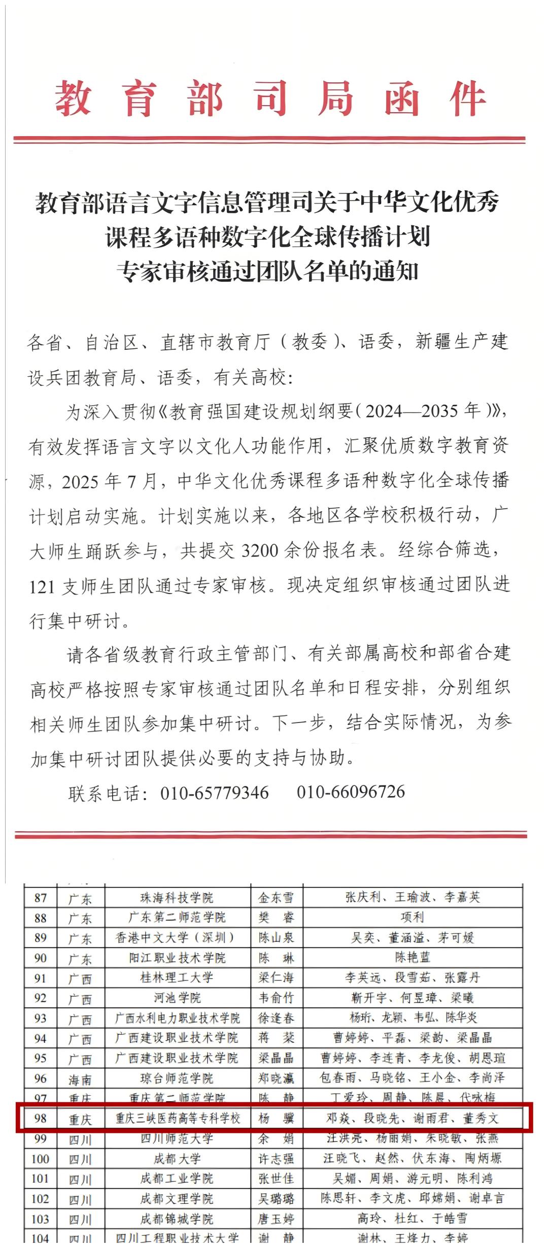 近日,教育部揭晓“中华文化优秀课程多语种数字化全球传播计划”专家审核通过团队名单。我校杨骥、邓焱、段晓先、谢雨君、董秀文老师组成的教学团队成功通过专家审核,入选国家团队。据悉,此次全国范围内共有3200余个教学团队参与角逐,最终121支团队脱颖而出,重庆市仅有两支团队入选。