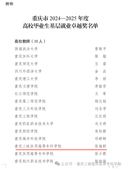 近日,重庆市教育委员会正式公布了2024-2025年度“高校毕业生基层就业卓越奖”获奖名单。我校临床医学院辅导员张海朝与2017届公共卫生管理专业毕业生余霞双双上榜。这一荣誉不仅是对获奖师生个人的高度认可,更是我校长期以来服务地方发展、引导毕业生扎根基层建功立业育人实效的集中体现。