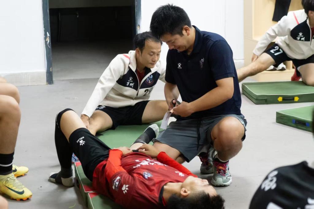 任治豪曾在武警部队服役,军旅生涯练就其高压下处置突发状况的过硬本领,参加全国中冠联赛队医实践经验极大地提高了临场救治能力。集运动员、医学生、退役军人于一身的优势让他在专职队医竞争中脱颖而出,他为40余名运动员提供全流程后勤医疗保障及急性运动损伤应急处置,专业高效的技术技能赢得教练与队员一致认可。