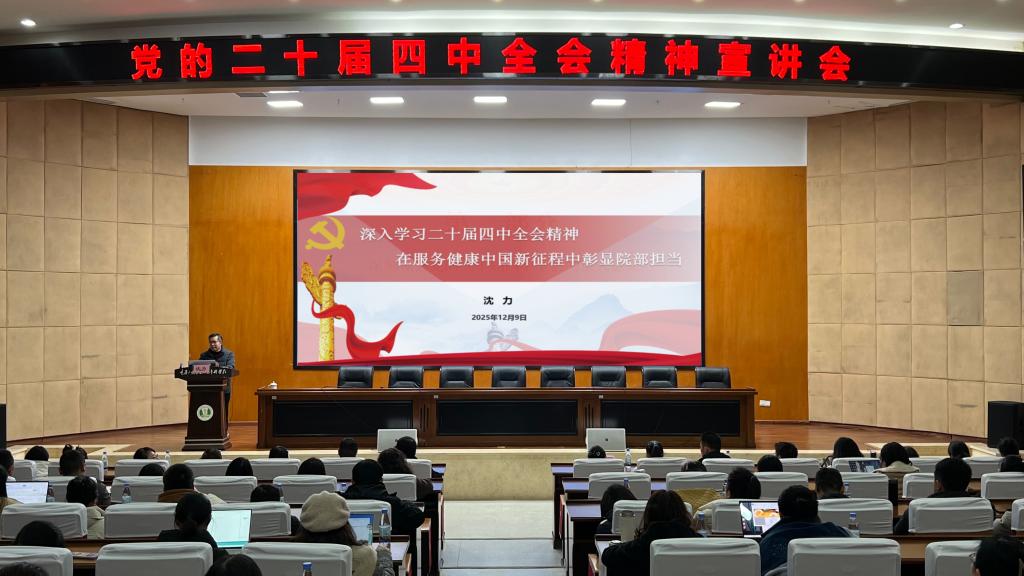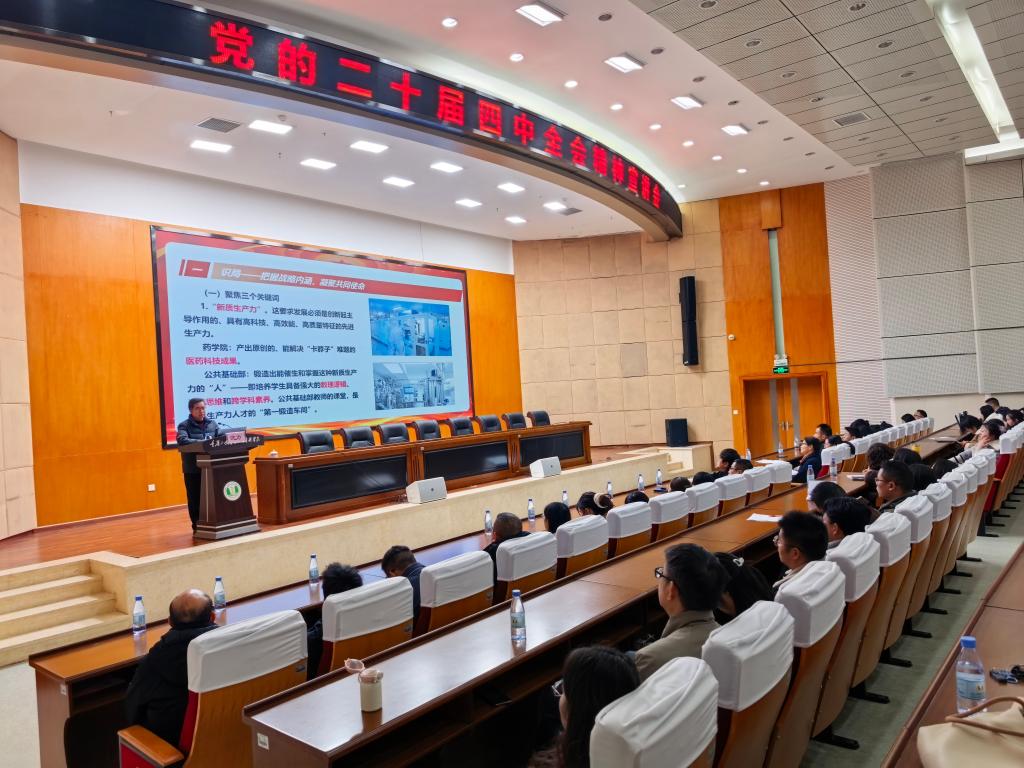 为精准传达党的二十届四中全会精神,推动院校工作与国家战略同频共振,12月9日,学校党委委员、副校长沈力以“深入学习二十届四中全会精神,在服务健康中国新征程中彰显院部担当”为题,为药学院、公共基础部118名教职工作专题宣讲,全体人员聚精会神,深入学习全会精神。