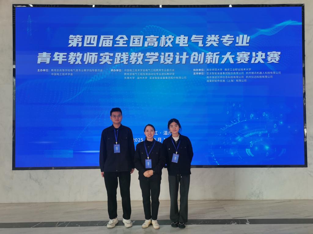 2025年12月18日-12月20日,第四届全国高校电气类专业青年教师实践教学设计创新大赛电子电工技术应用赛项决赛在浙江省温州市永嘉工业园区亚龙智能装备集团股份有限公司圆满落幕。我校药学院唐大芳老师带领23级制药设备应用技术专业学生高源鸿、25级药品与医疗器械专业学生黎芸凤组成参赛团队,在师生同赛的激烈比拼中凭借扎实功底与出色表现脱颖而出,喜获全国二等奖。