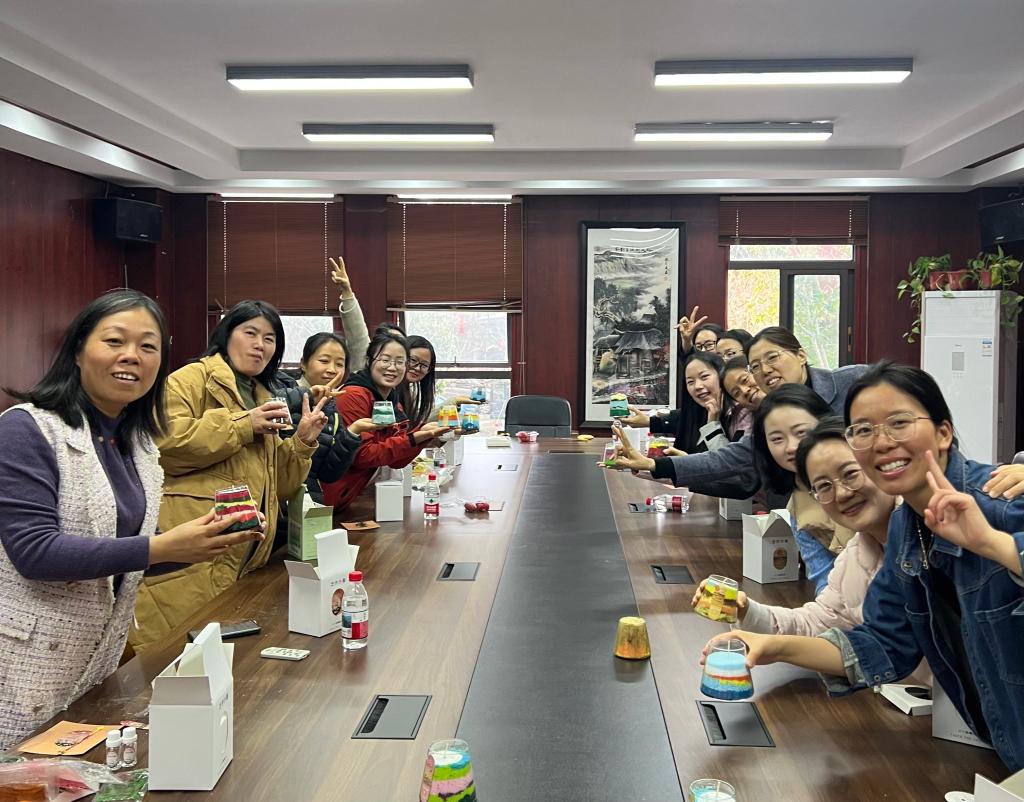 在手工创作环节,大家参与香氛沙画香薰蜡烛DIY,在动手创作中舒缓压力、陶冶情操。作品完成后,教师们展示成果、分享创作灵感与节日寄语,并集体合影留念,现场氛围温馨愉悦。