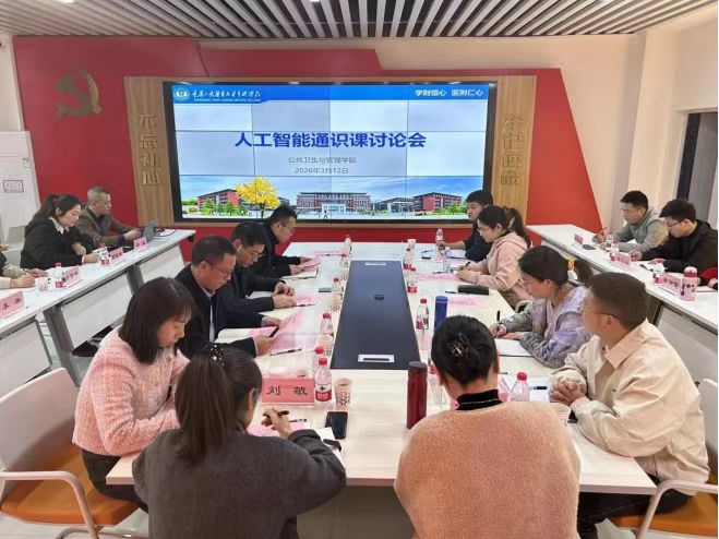 为深入贯彻落实《国务院关于深入实施"人工智能+"行动的意见》《重庆市推动"人工智能+教育"行动方案》,响应2026年全国两会关于深化拓展"人工智能+"、推进教育数字化转型的战略部署,促进人工智能与医学教育的有机融合,健全人才培养机制,2026年3月12日,学院在B6-513会议室组织召开了人工智能通识课专题讨论会。学校党委委员、副校长苏绪林,教务处副处长边茂飞,图情中心、公共卫生与管理学院直属党支部书记、副院长郑代坤以及计算机、大数据与人工智能等相关专业教师二十余人出席了本次调研会。