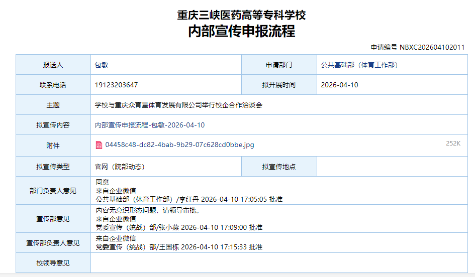 4月10日,学校与重庆众育星体育发展有限公司在学术中心108会议室举行校企合作洽谈会。合作交流中心主任李魁华、公共基础部负责人李红丹、重庆众育星体育发展有限公司负责人蒲军及相关工作人员出席会议。会议围绕前期合作成效、未来产业融合方向及安全管理要求展开深入交流,并签署新一轮合作协议。